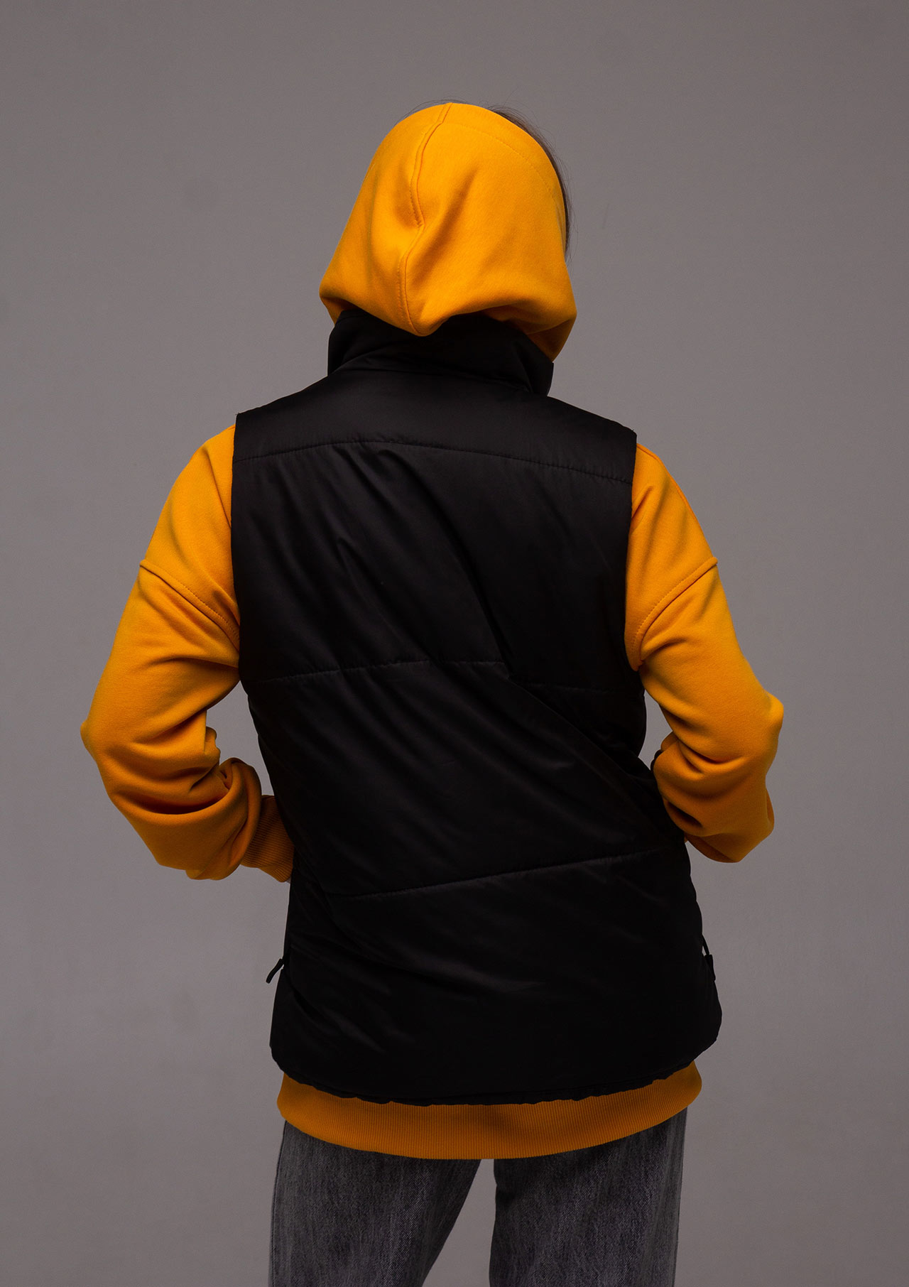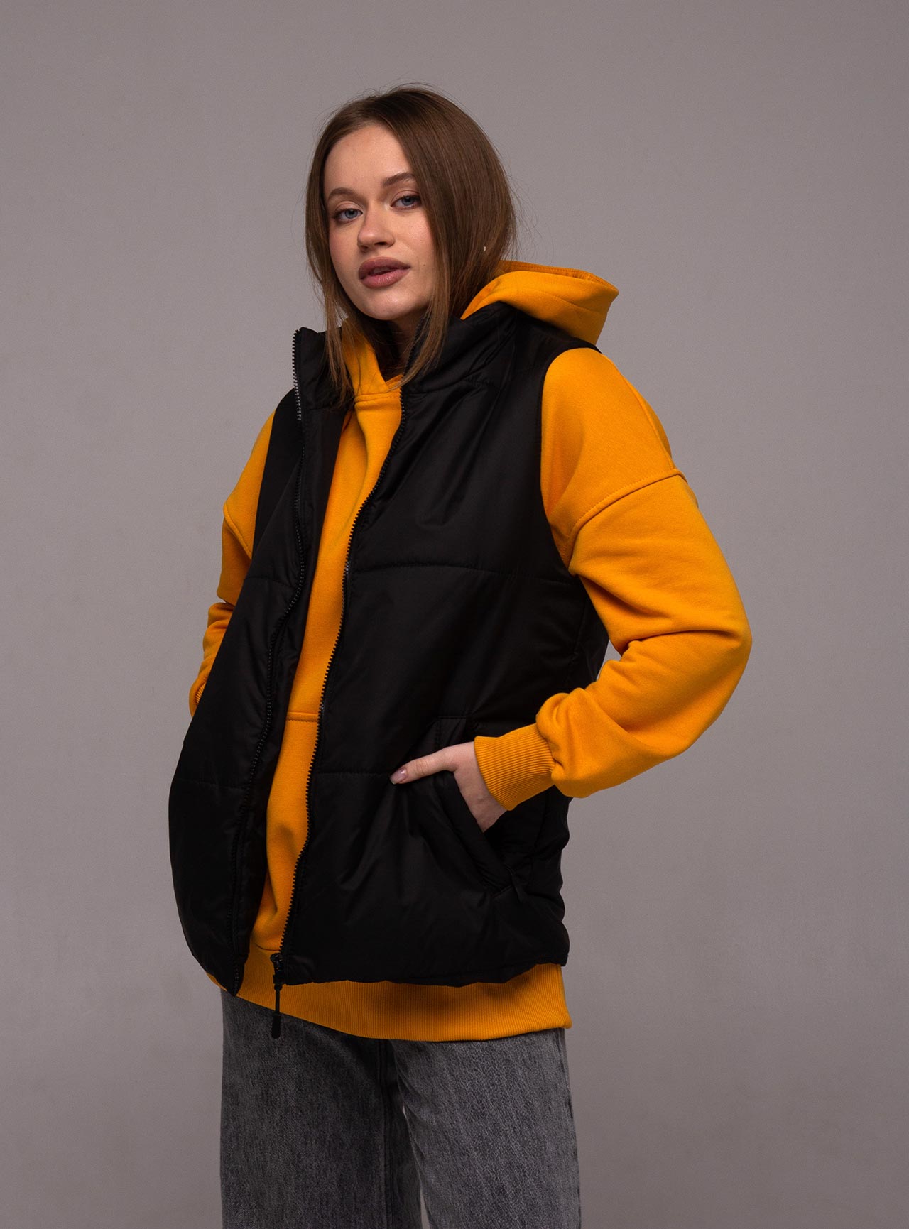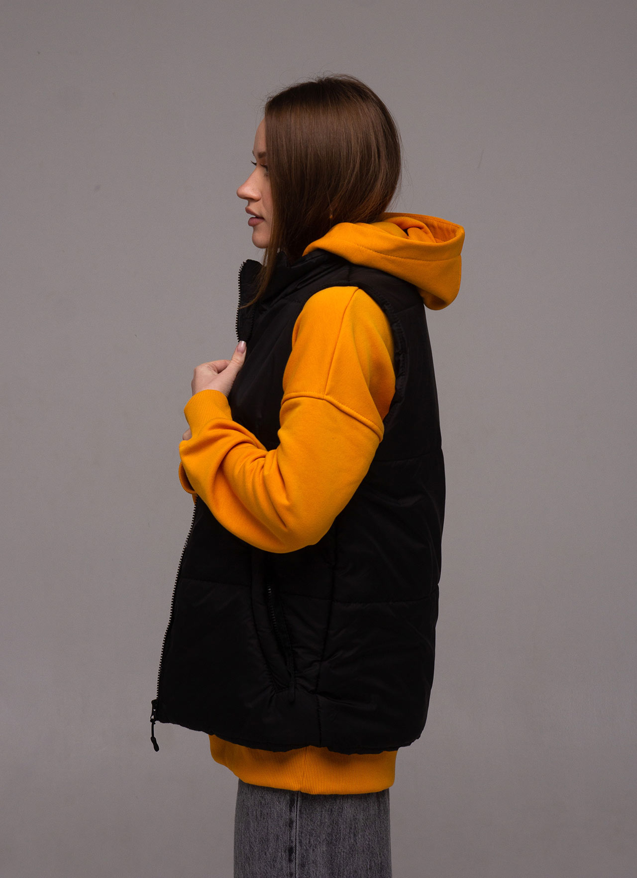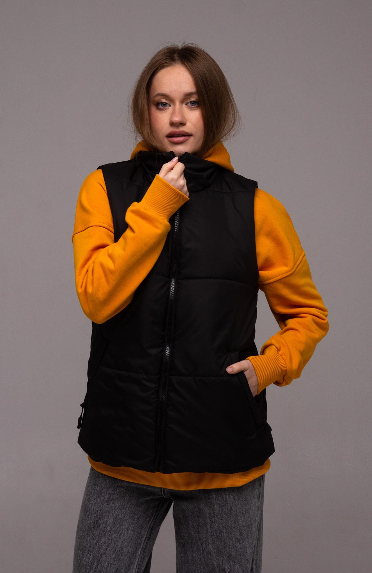 Жилет прямого кроя, без капюшона, с высоким воротником и боковыми карманами на молнии. Основная застежка – молния. Она может быть как бюджетной (Китай), так и дорогой (Япония YKK). Основная ткань - плащевка (лаке), наполнитель - синтепон плотностью 200 г/м и подкладка плотностью 190 г/м. Стежка жилета специально выполнена широко, чтобы оставалась возможность нанесения логотипа на груди и спине. По-желанию клиента стежку можно выполнить уже.