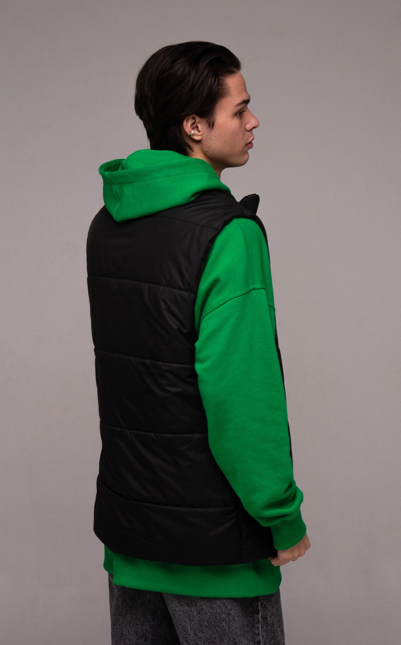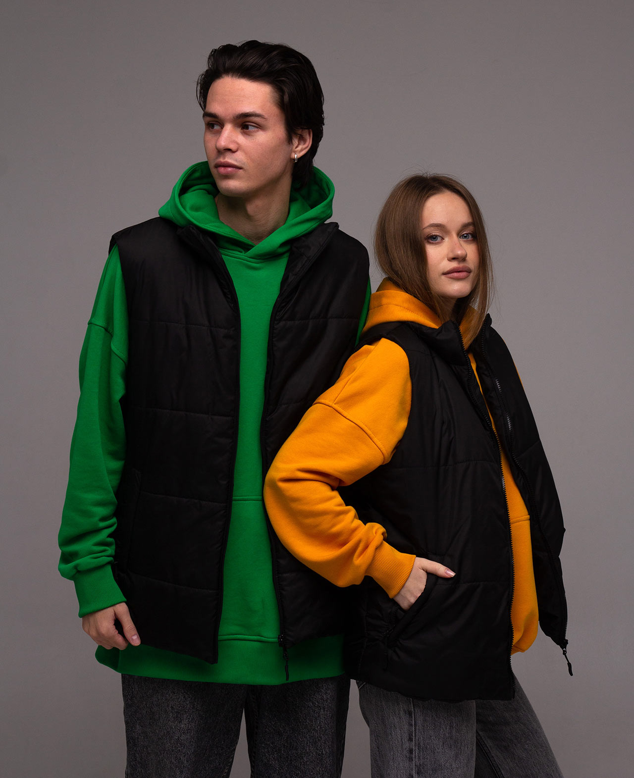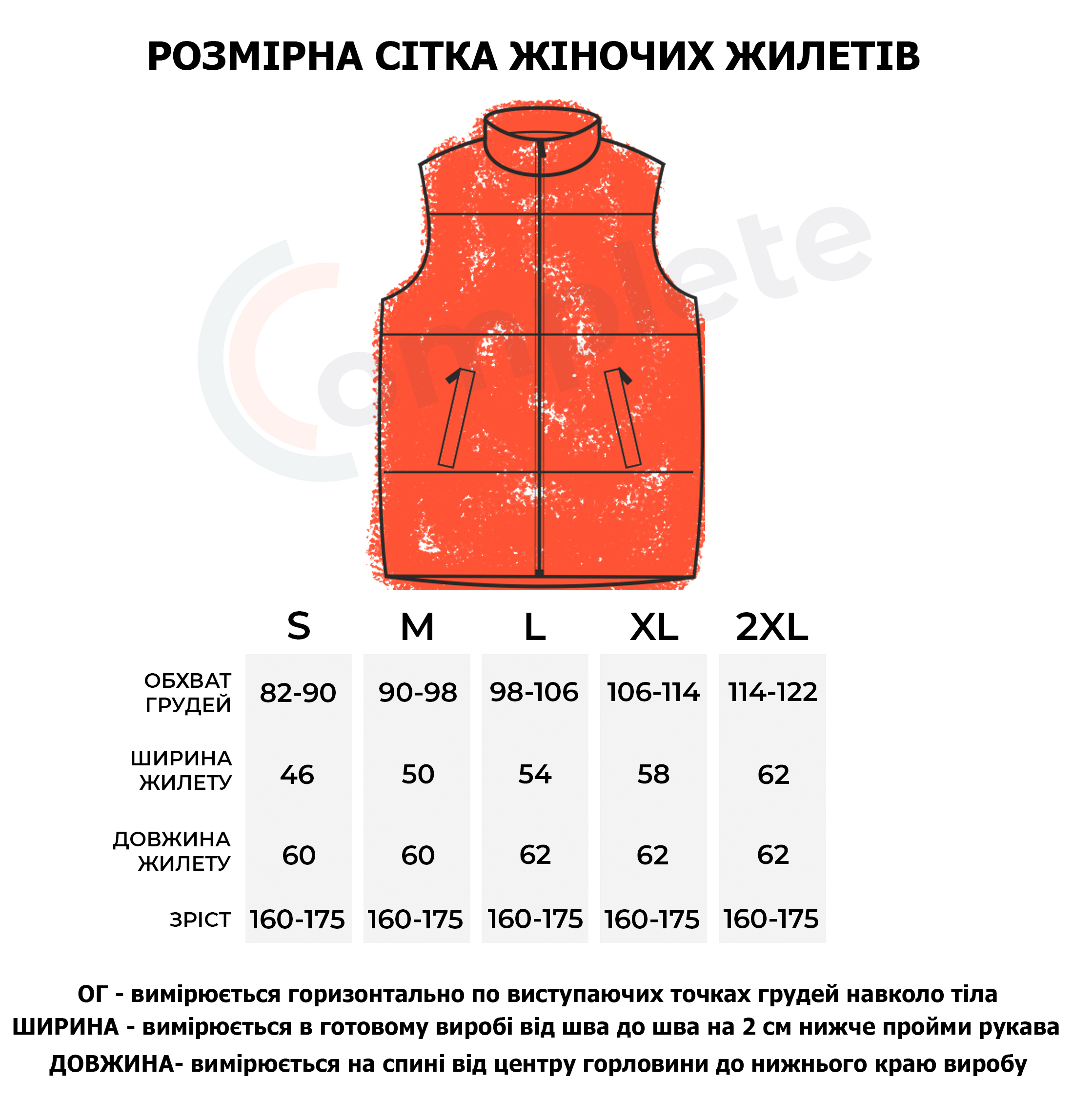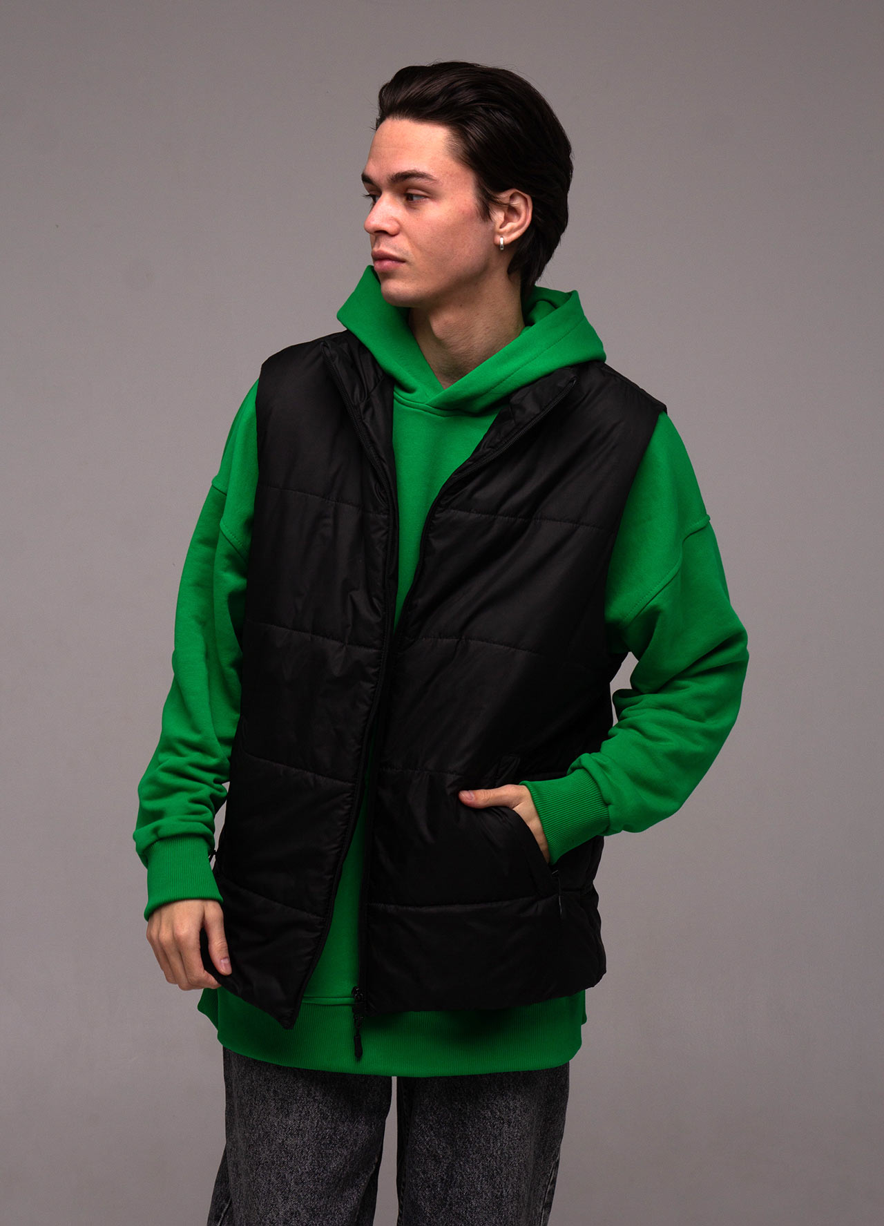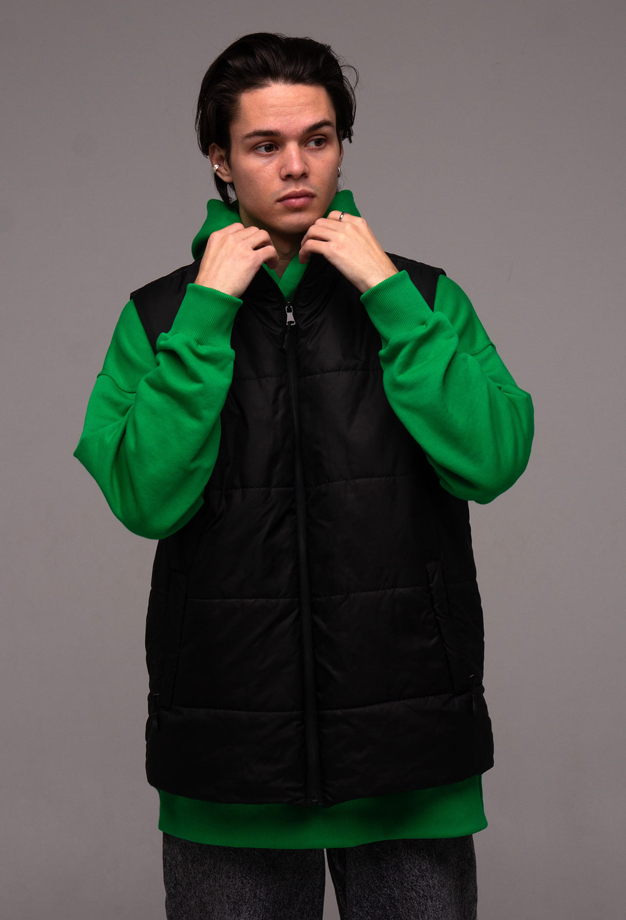 Жилет прямого кроя, без капюшона, с высоким воротником и боковыми карманами на молнии. Основная застежка – молния. Она может быть как бюджетной (Китай), так и дорогой (Япония YKK). Основная ткань - плащевка (лаке), наполнитель - синтепон плотностью 200 г/м и подкладка плотностью 190 г/м. Стежка жилета специально выполнена широко, чтобы оставалась возможность нанесения логотипа на груди и спине. По-желанию клиента стежку можно выполнить уже.