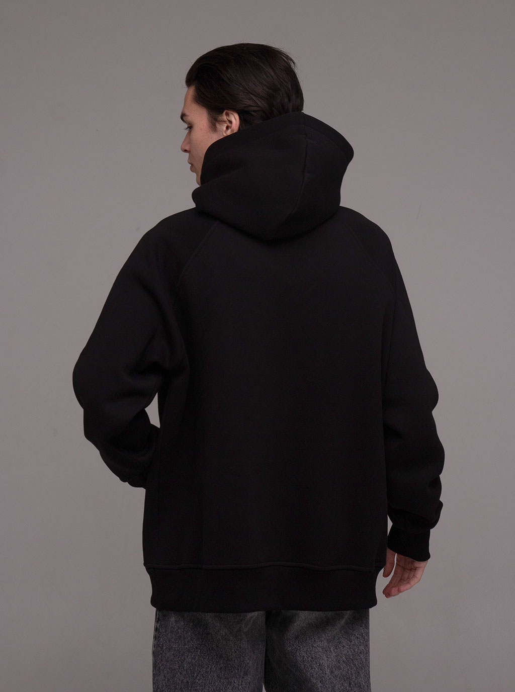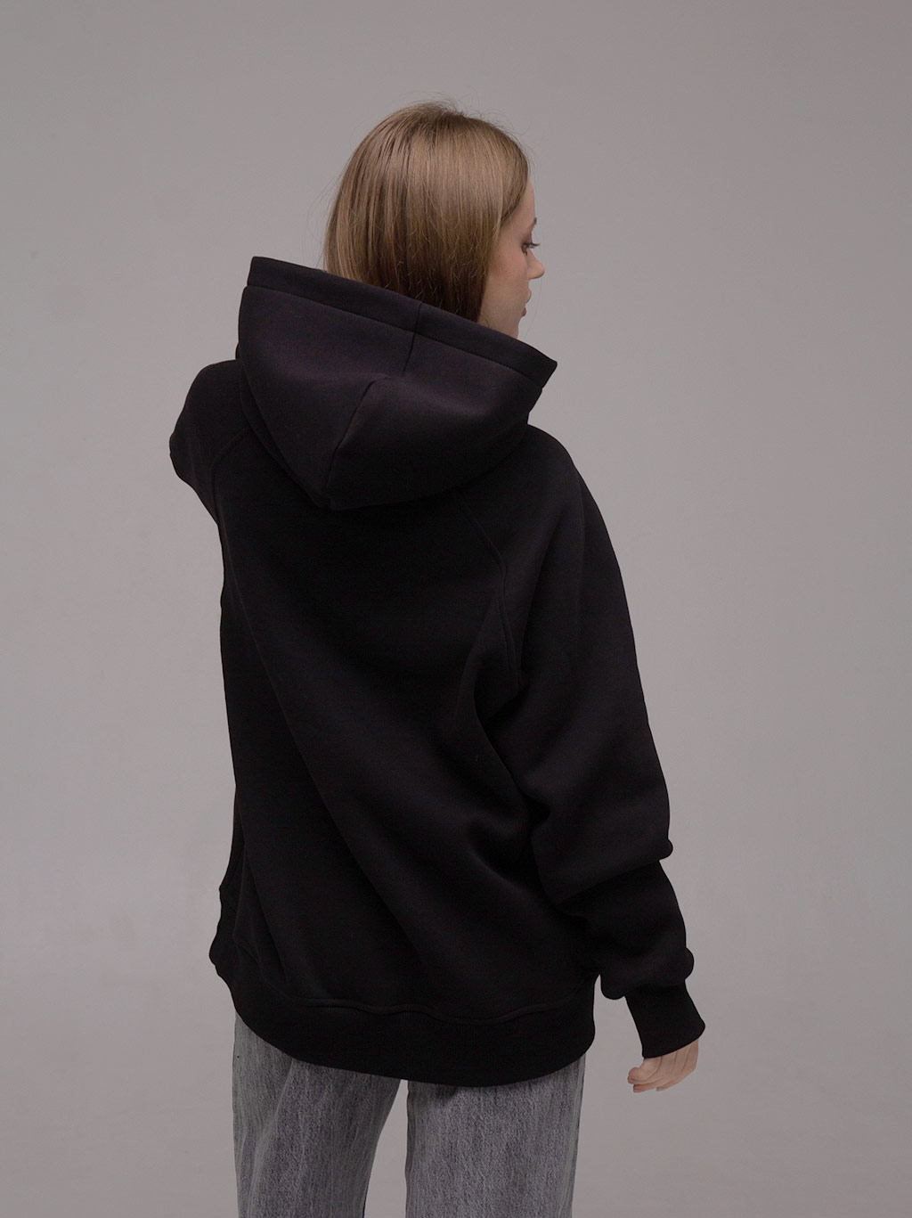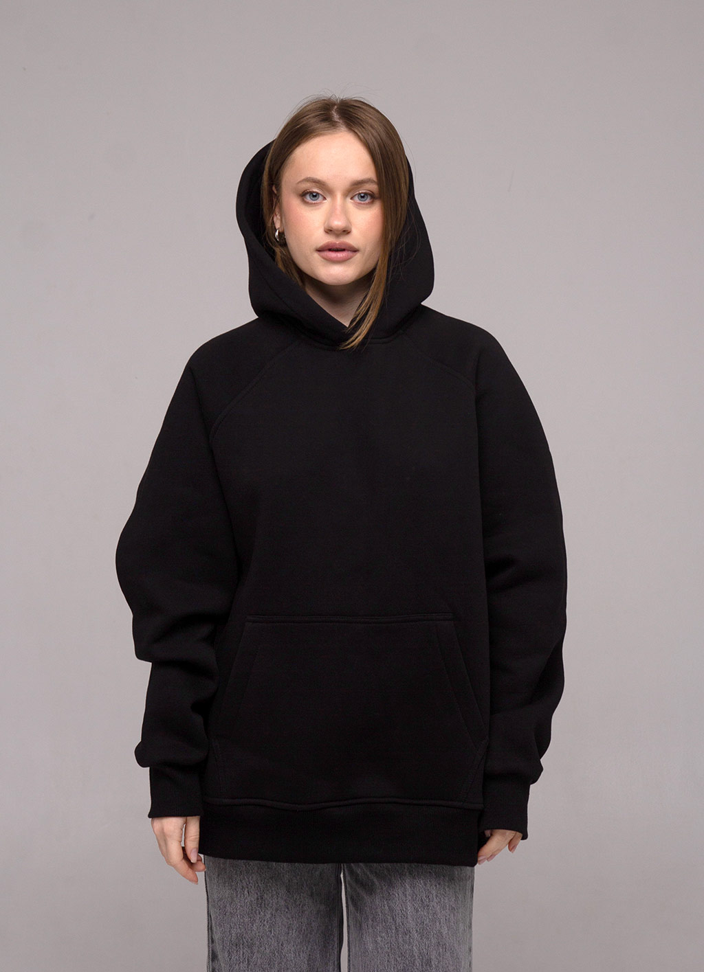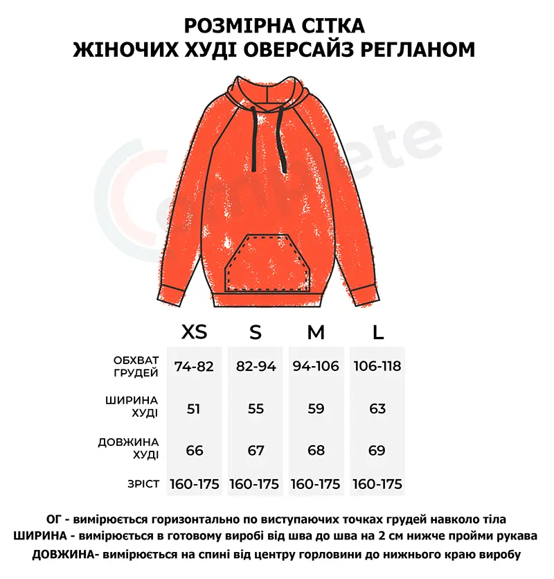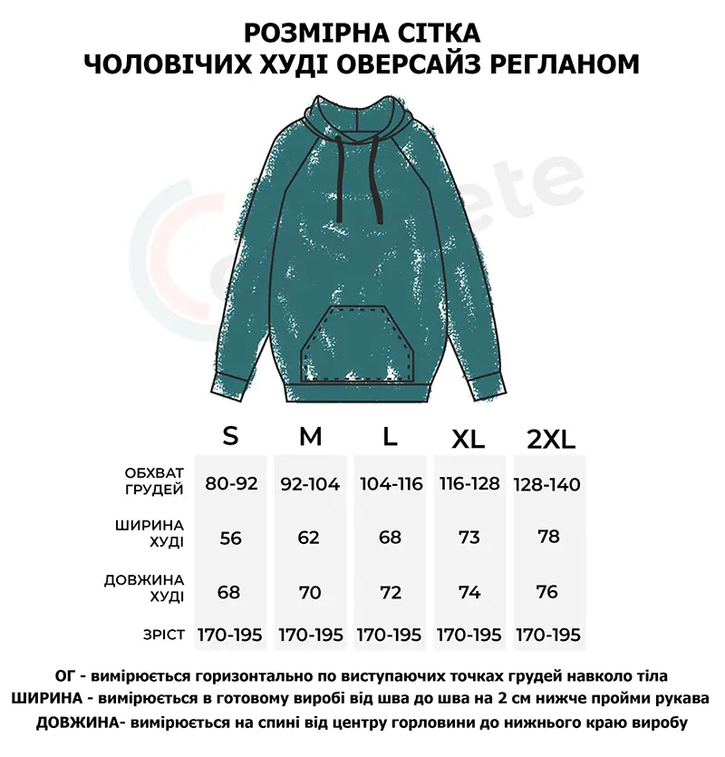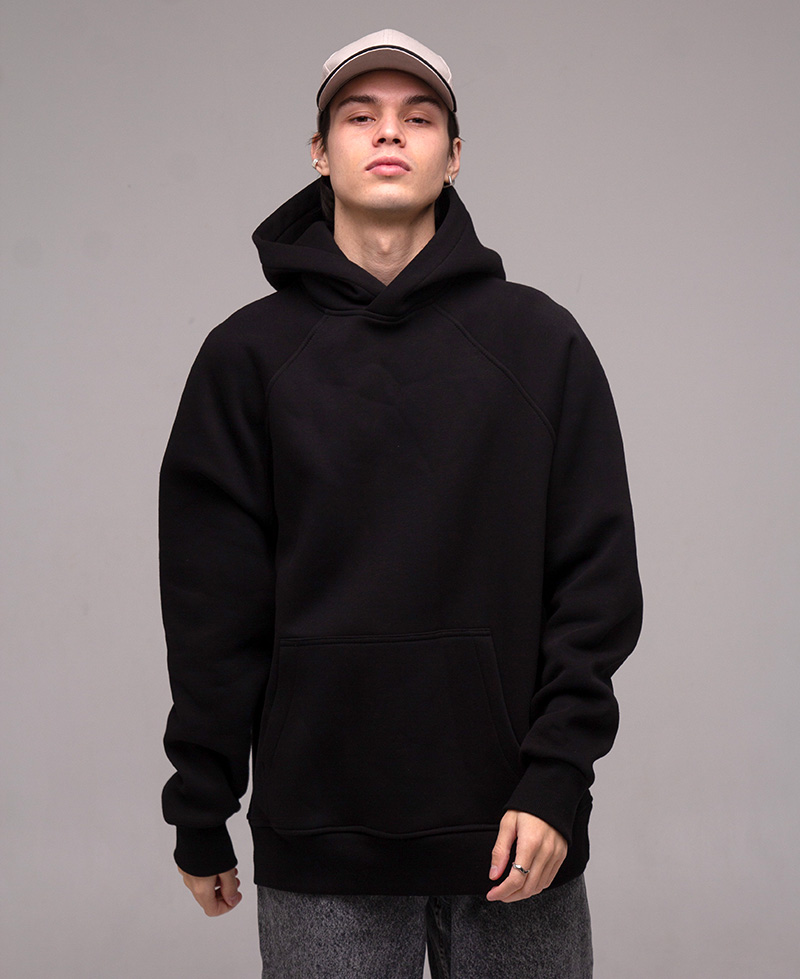 Худі оверсайз з рукавом реглан, вшитим в горловину. Воно достатньо вільного крою для чоловіків і жінок. За рахунок особливості крою рукава регланом худі не сковує рухи. Виріз горловини круглий. Капюшон подвійний, теплий, має гарну форму і може бути виконаний з іншим кольором тканини в середині. В капюшон можемо ставити шнурок будь-якої форми та кольору. Пояс і манжети кофти виконані із щільної гумки- кашкорсе. Внутрішній шов горловини оздоблений кіперною стрічкою, яка посилює її зносостійкість. Пояс худі, пройма рукава і горловина оздоблені додатковою відстрочкою. В боковому шві вшитий розмірник з вказанням складу тканини, статі та розміром виробу.