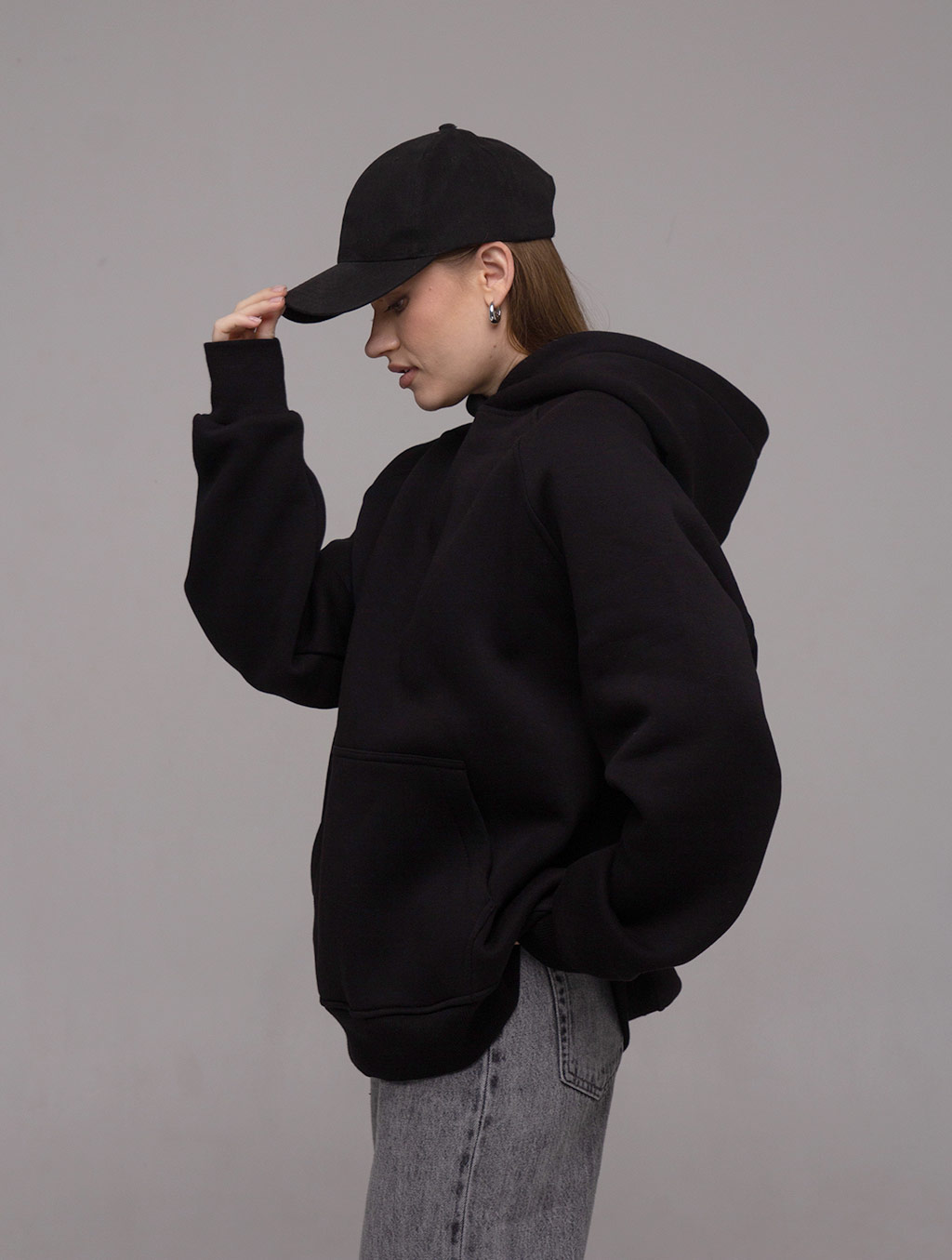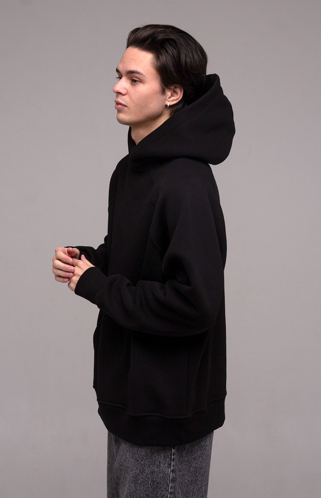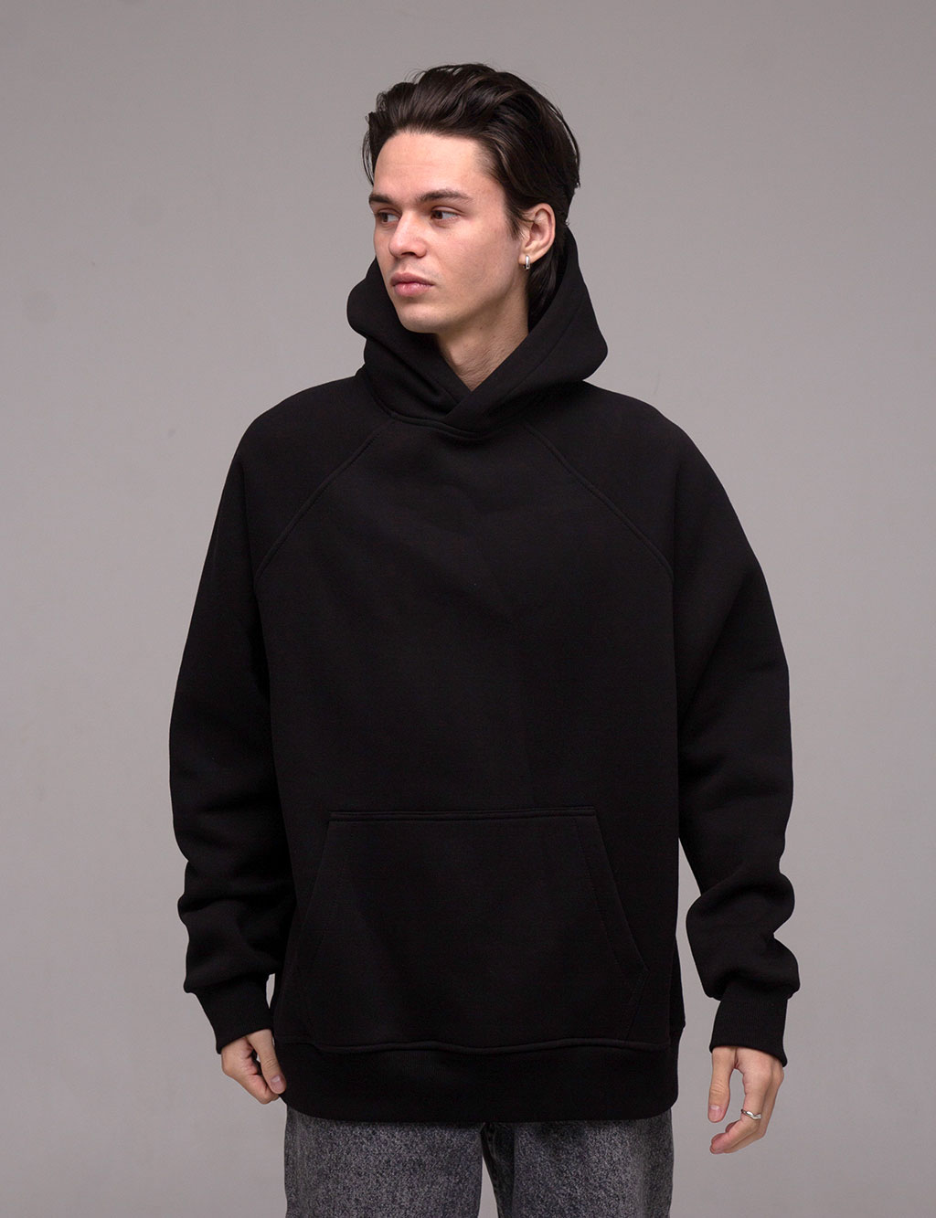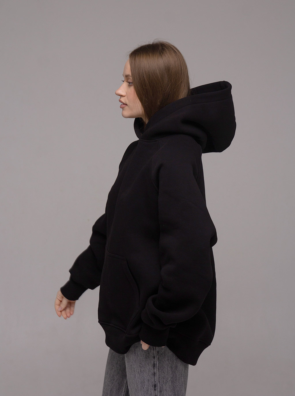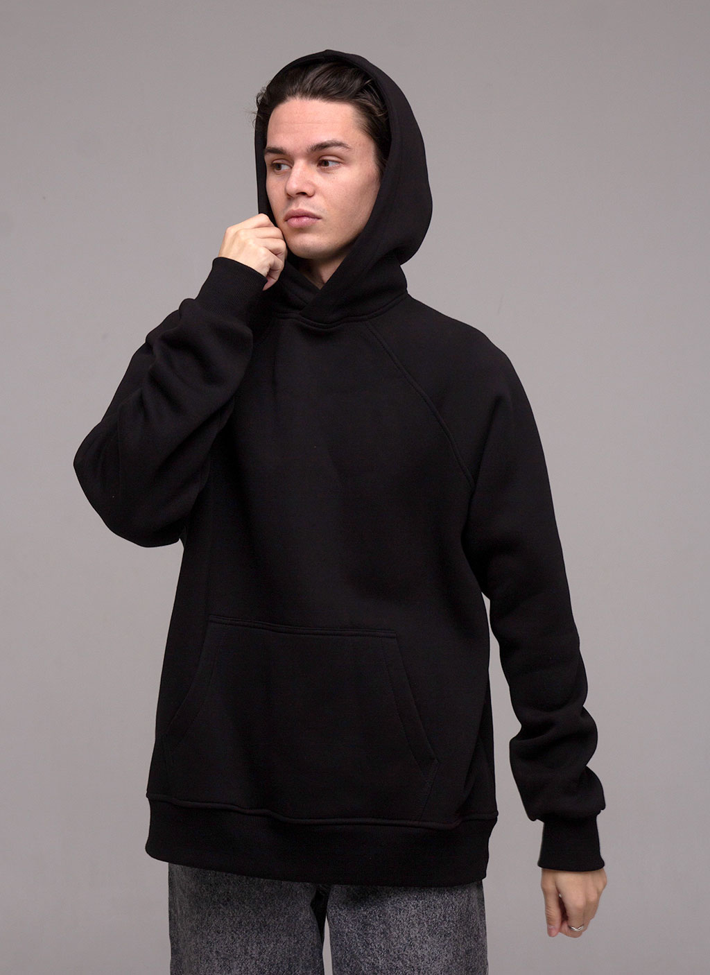 Худі оверсайз з рукавом реглан, вшитим в горловину. Воно достатньо вільного крою для чоловіків і жінок. За рахунок особливості крою рукава регланом худі не сковує рухи. Виріз горловини круглий. Капюшон подвійний, теплий, має гарну форму і може бути виконаний з іншим кольором тканини в середині. В капюшон можемо ставити шнурок будь-якої форми та кольору. Пояс і манжети кофти виконані із щільної гумки- кашкорсе. Внутрішній шов горловини оздоблений кіперною стрічкою, яка посилює її зносостійкість. Пояс худі, пройма рукава і горловина оздоблені додатковою відстрочкою. В боковому шві вшитий розмірник з вказанням складу тканини, статі та розміром виробу.